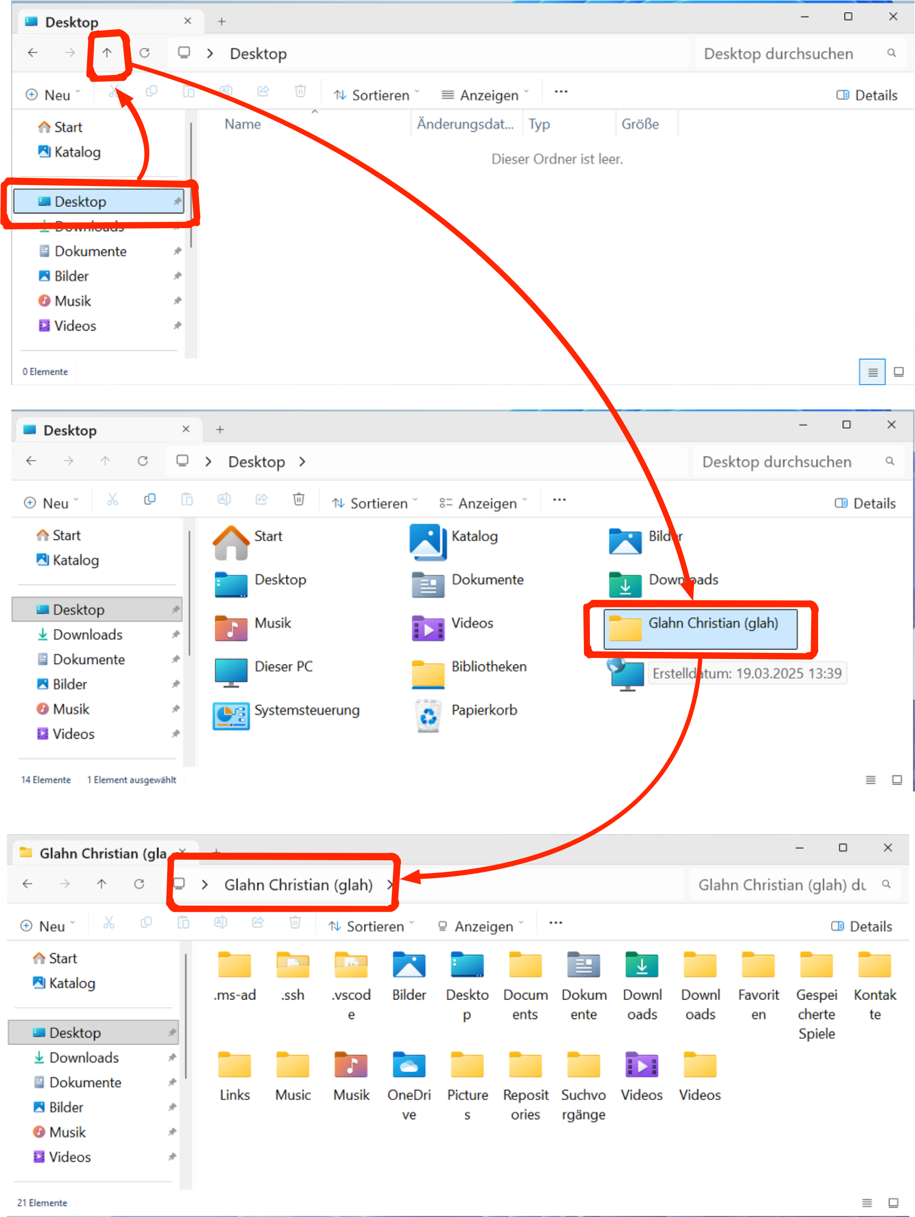 Unter Windows wählt man dazu im Explorer den Schnellzugriff für das Desktop aus, tippt anschliessen auf den Pfeil nach oben. Im der folgenden Ansicht taucht ein Verzeichnis mit den Namen des aktuellen Anwender*In auf. Auf dieses Verzeichnis muss doppeltgeklickt werden, um das Heimatverzeichnis zu erreichen.