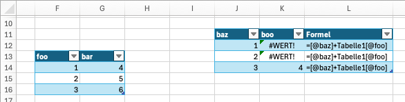 Wird der @-Operator für eine Adresse in einer anderen Tabelle verwendet, dann müssen die Wertebereiche beider Tabellen in der gleichen Zeile starten, weil der @-Operator erfordert, dass die referenzierte Adresse in der gleichen Arbeitsblattzeile und nicht in der gleichen Tabellenzeile steht. Verweist eine @-Adressierung auf eine Tabellenspalte, die an der gleichen Arbeitsblattzeile keinen Wert hat, dann erzeugt der Operator einen #WERT!-Fehler (s. Abbildung 9.2).